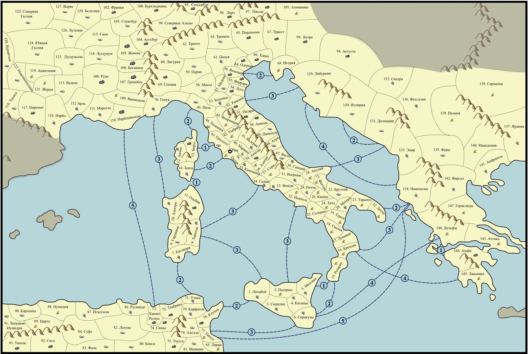 Сардиния и Корсика принадлежат Риму, но не во всех провинциях есть управляющие. Сицилия — буферная зона после войны с Карфагеном, не принадлежит никому.