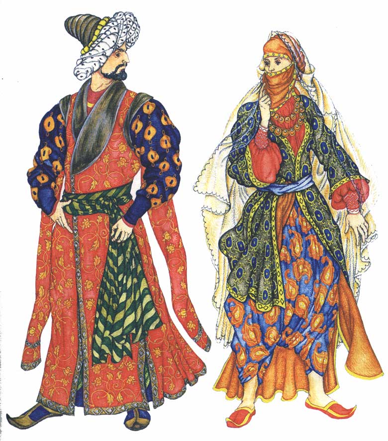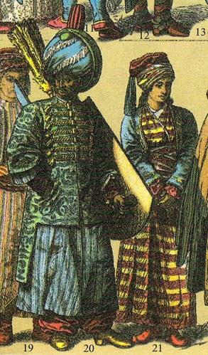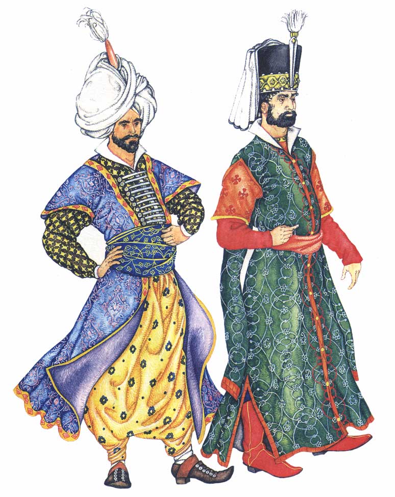 ТУРЕЦКИЙ КОСТЮМ В середине XV в., когда турецкий султан Мухаммед II завоевал Константинополь, Византийская империя окончательно пала. Турки-османы не воспринимали культуры покоренных народов, так как религия не допускала никакого изменения внешности- Однако у более развитых арабов и персов турки переняли внешнюю роскошь, а огромные богатства, награбленные в войнах, способствовали тому, что турецкий двор стал необычайно великолепным и пышным. Турецкая одежда изготовлялась из самых разнообразных тканей: льняных, бумажных, шерстяных, суконных, а также из тафты, атласа, муслина, батиста и даже меха и сафьяна. Костюмы были белого, черного, зеленого, иногда красного цветов (одежды такого цвета носил сам пророк Мухаммед). Турецкие султаны одевались только в белые одежды; военные - в белые и зеленые. У великого визиря парадный костюм был из белого шелка, у муфтия - из белого сукна, духовные лица носили зеленое сукно. Мужской костюм Мужчины всех сословий носили штаны, рубашку, камзол, куртку или кафтан, верхний кафтан, кушак. Штаны ("дзагшин") шили из тонкого шелка или полотна. Мужчины надевали их на голое тело и стягивали вокруг пояса шнурком с вышитыми концами. Вначале штаны были широкие и длинные, они складками спускались на ступню. Затем появился еще один их фасон: они укоротились до колен. Такие широкие укороченные штаны носили воины-янычары. Под эти штаны надевали чулки. Поверх штанов турки носили длинную рубашку ("каисо") с длинными широкими рукавами, доходившую до середины икр или до лодыжек. Рубашки шили из тонкой полосатой полушелковой ткани, из муслина, шелка и полотна. Длинные кафтаны с широкими и очень длинными рукавами шили из одноцветной или полосатой ткани - полубумажной или полушелковой, застегивали их на пуговицы или запахивали. Полы кафтана можно было заворачивать и прикреплять к поясу. Янычары собирали их сзади в широкие складки. У военных были кафтаны с короткими, до локтя, рукавами или вообще без рукавов. В конце XVI в. кафтан сменился камзолом ("субун") и курткой ("суджери") Распашной камзол шился из синего или красного сукна, украшался вышивкой, а по бортам пуговицами, и доходил длиной до бедер. Более длинная куртка надевалась поверх камзола. Кафтан и камзол (но не куртку) турки подпоясывали кушаком, который сворачивали из шали или из большого куска узорчатого шелка и обшивали его концы кистями и бахромой. Военные вместо кушака носили ремень или окованный металлом кожаный пояс. Верхней одеждой у турок было "фередже". Его надевали поверх остального платья. Это была длинная широкая одежда с длинными широкими, иногда разрезными рукавами. На каждый день его шили из толстой шерстяной ткани синего или зеленого цвета. А на выход - из шелка, дорогого сукна, подбивали и оторачивали дорогим мехом. У него также мог быть отложной воротник, а впереди - шнуры и пуговицы. Цвет и отделка фередже зависели от звания и должности носившего. В XVI в. появились фередже с узкими декоративными рукавами. В холодную погоду турки носили также плащи из верблюжьего сукна. Женский костюм Костюм турецких женщин был похож на мужской. Так же, как и мужчины, они носили штаны, которые шились из кисеи, шелка, полотна желтого цвета или в полоску. Полотняная рубашка походила на мужскую, но короче. Сверху надевали: шелковый узорчатый полукафтан с широкими рукавами, из-по